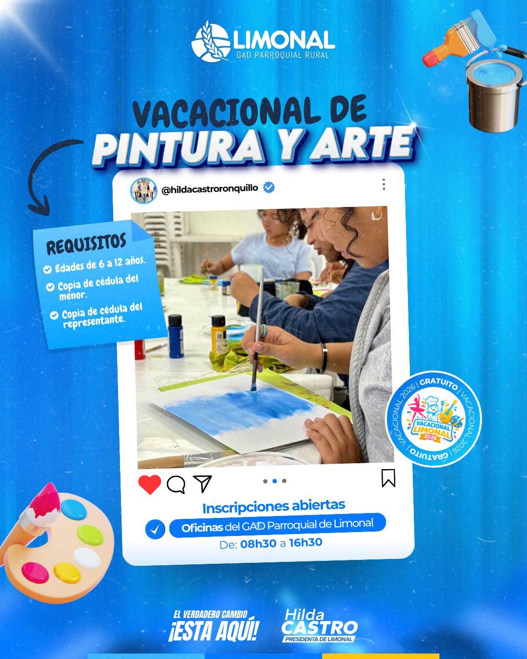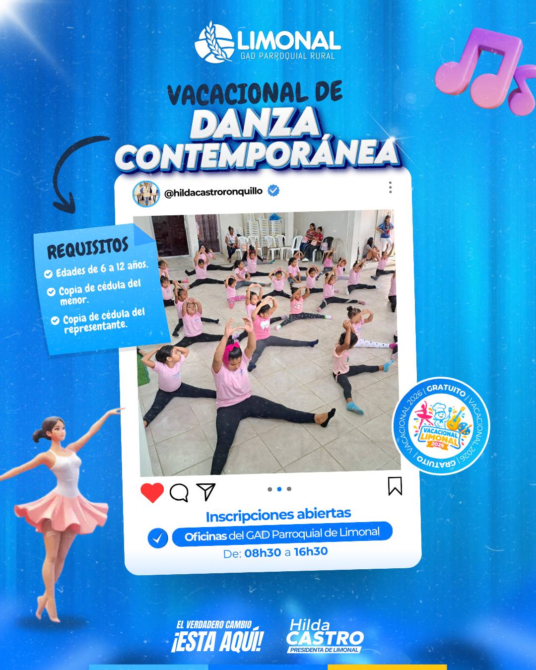 El GAD Parroquial Rural Limonal y su presidenta, Hilda Castro Ronquillo , invitan a todos los padres de familia a inscribir a sus niños y niñas en nuestros cursos vacacionales, un espacio diseñado para aprender, divertirse y desarrollar nuevas habilidades durante las vacaciones.