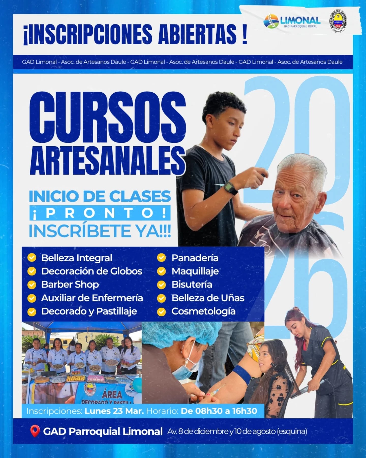 El GAD Parroquial de Limonal y la Asociación de Artesanos de Daule te invitan a ser parte de los Cursos Artesanales 2026, una oportunidad única para crecer personal y profesionalmente.