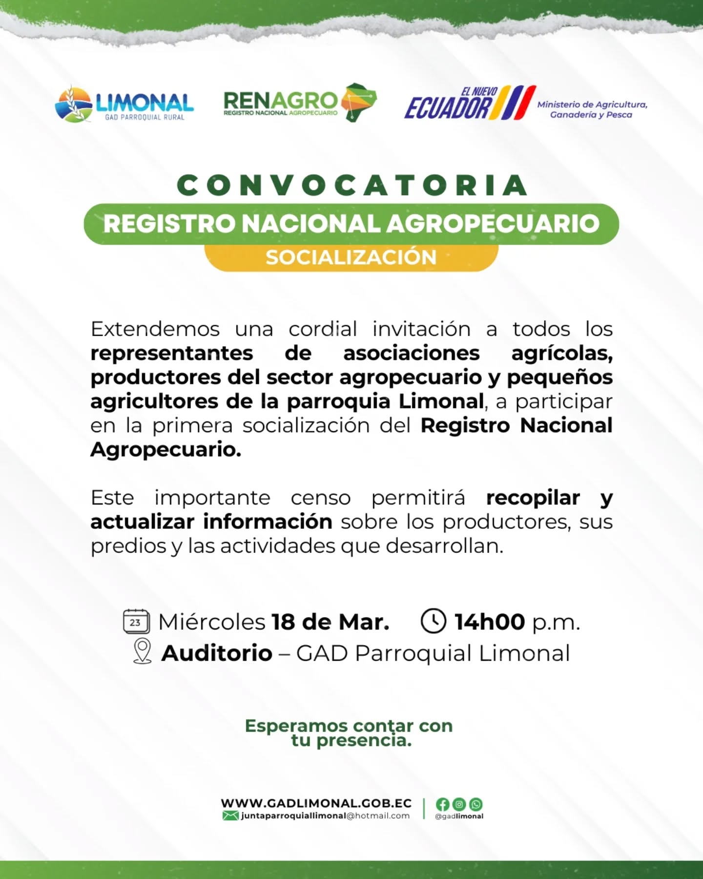 Invitamos cordialmente a representantes de asociaciones agrícolas, productores del sector agropecuario y pequeños agricultores de Limonal a participar en la primera jornada de socialización del Registro Nacional Agropecuario.